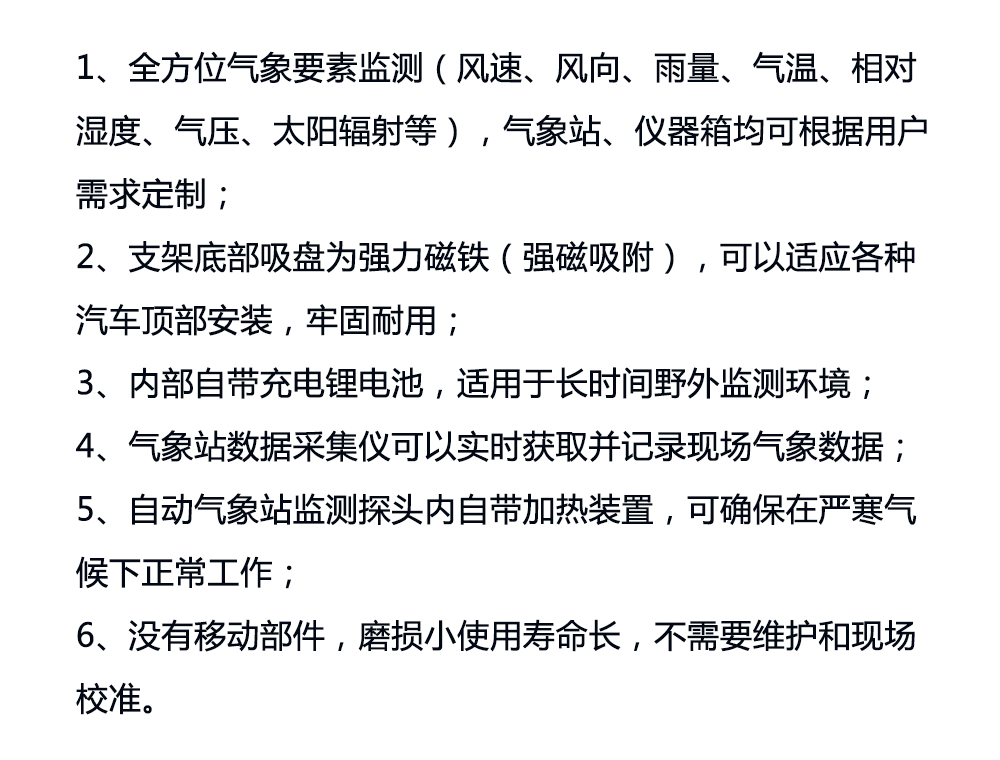车载式自动气象站是一款能测量多要素气象参数的专业级便携式微型气象站,可同时测量大气温度、大气湿度、风速、风向、气压、雨量、粉尘浓度、光照度等多种环境参数。其特点是集成度高,检测精度高,响应时间快。自动气象站底部安装了两块高强力磁铁(橡胶包裹),可以方便吸附在汽车顶部。以上各项功能模块我们均可根据用户的需求,进行自由的组合装配,所以更能满足不同客户的使用。车载式自动气象站配有专用的仪器箱,携带轻便。整套设备使用简单方便。