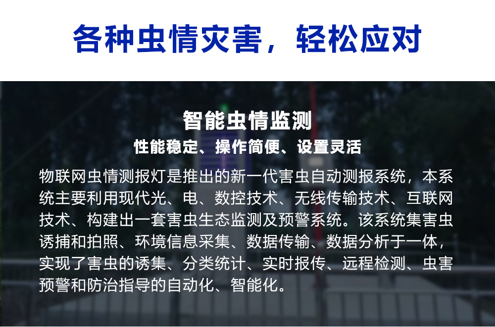 物联网虫情测报预警站是我公司推出的新一代害虫自动测报系统,本系统主要利用现代光、电、数控技术、无线传输技术、户联网技术、构建出一套害虫生态监测及预警系统。该系统集害虫诱捕和拍照、环境信息采集、数据传输、数据分析于一体,实现了害虫的诱集、分类统计、实时报传、远程检测、虫害预警和防治指导的自动化、智能化。