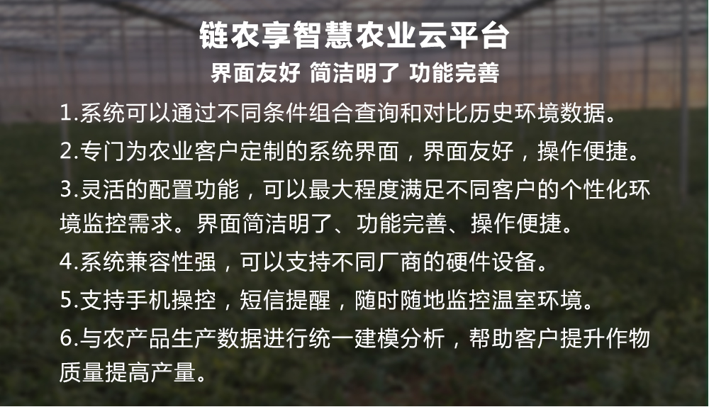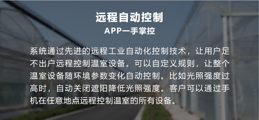 系统通过先进的远程工业自动化控制技术,让用户足不出户远程控制温室设 备。可以自定义规则,让整个温室设备随环境参数变化自动控制。比如光照强 度过高时,自动关闭遮阳降低光照强度。客户可以通过手机在任意地点远程 控制温室的所有设备。