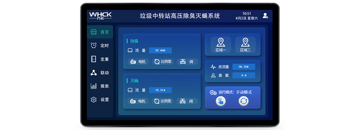 除臭灭蝇设备采用间歇运行的方式,根据现场的除臭灭蝇流量系数、区域以及工作时间进行设置,从而有效的控制除臭灭蝇效果及除臭灭蝇的运行成本。